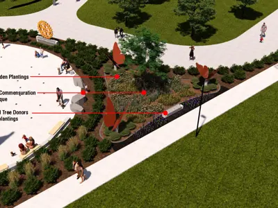 As we progress through redevelopment, phase by phase, memorials within any given phase will be reviewed and replacement will be evaluated and incorporated into those respective phases. Within the area of the skate trail/water feature, there are approximately 17 existing memorial trees. As part of the skate trail/water feature phase of the project, there is a proposed garden to be built, with sculptures, to replace the existing memorials. Administration has been contacting the next of kin for the existing memorials and they are generally supportive of this approach. For more information about the existing memorials, please contact us.