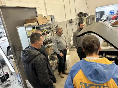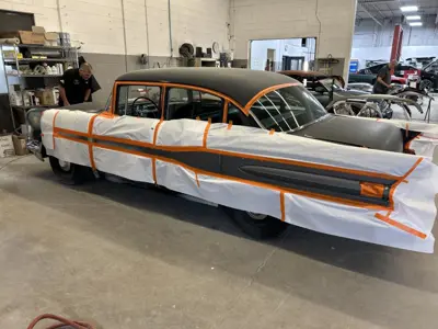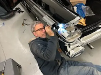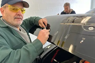 Domenic and his team at Fix Auto East have the restoration project of Car 48 well underway. Dave Dean, Mauro Tonin, Terry Seguin inspecting the work thus far.