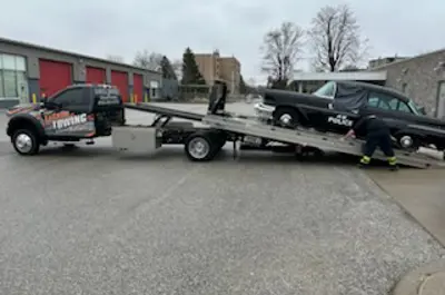 Historical Vehicle committee members, Dave Dean, Mauro Tonin, and Vito Campanaro at LaSalle Police Service Headquarters, removing all of the exterior metal trim, siren and roof light from Car 48, prepping it for restoration.
