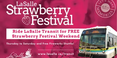 Ride LaSalle Transit 25 for free from Thursday, June 5 to Saturday, June 7! The bus service has been enhanced during the LaSalle Strawberry Festival with free service and extended hours to match those of the festival.