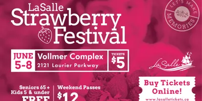 Save the date for this year’s LaSalle Strawberry Festival. Thursday, June 5 to Sunday, June 8, 2025, at the Vollmer Recreation Complex, 2121 Laurier Parkway.