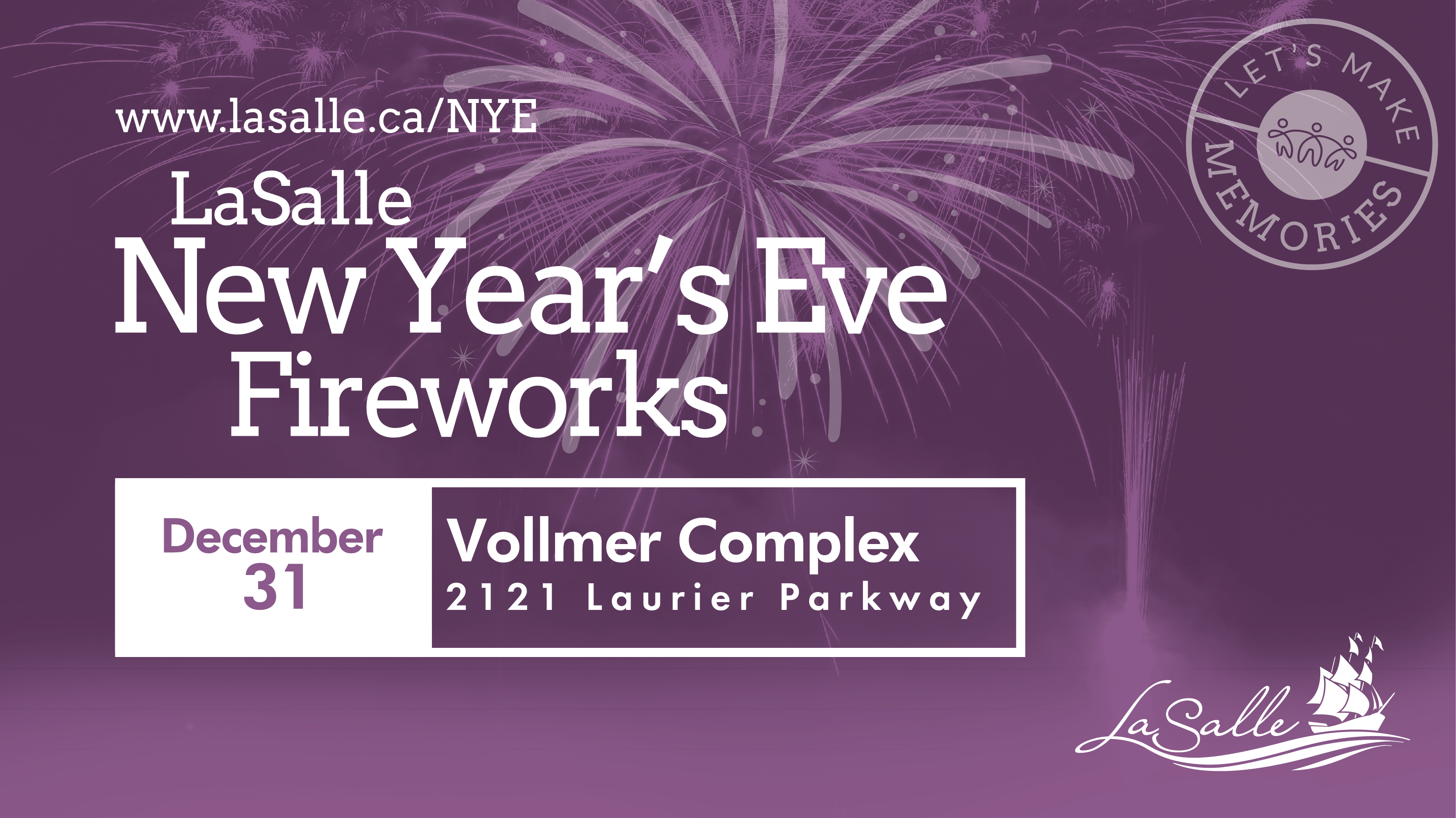 Ring in the New Year with us! LaSalle’s annual New Year's Eve Fireworks show is scheduled at the Vollmer Culture and Recreation Complex at 2121 Laurier Parkway. Find a parking spot on-site and cozy up with your loved ones for a dazzling fireworks display that will light up the night sky!