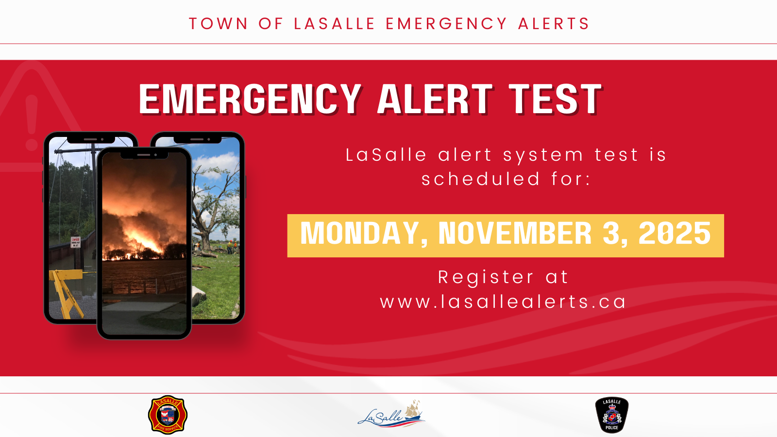 To ensure you are in our system and alerted in the event of a Town emergency, we will be testing the LaSalle Alerts mass notification system on Monday, November 3, 2025.