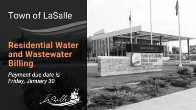 As a reminder, the Town of LaSalle sends water/wastewater bills quarterly (every three months) to residential customers in January, April, July, and October. Each bill includes three months' worth of usage. For example, January's bill covers usage for October, November, and December. The due dates are set to the last Friday of the month when the bill is issued. The next water/wastewater due date will be Friday, April 24, 2026.