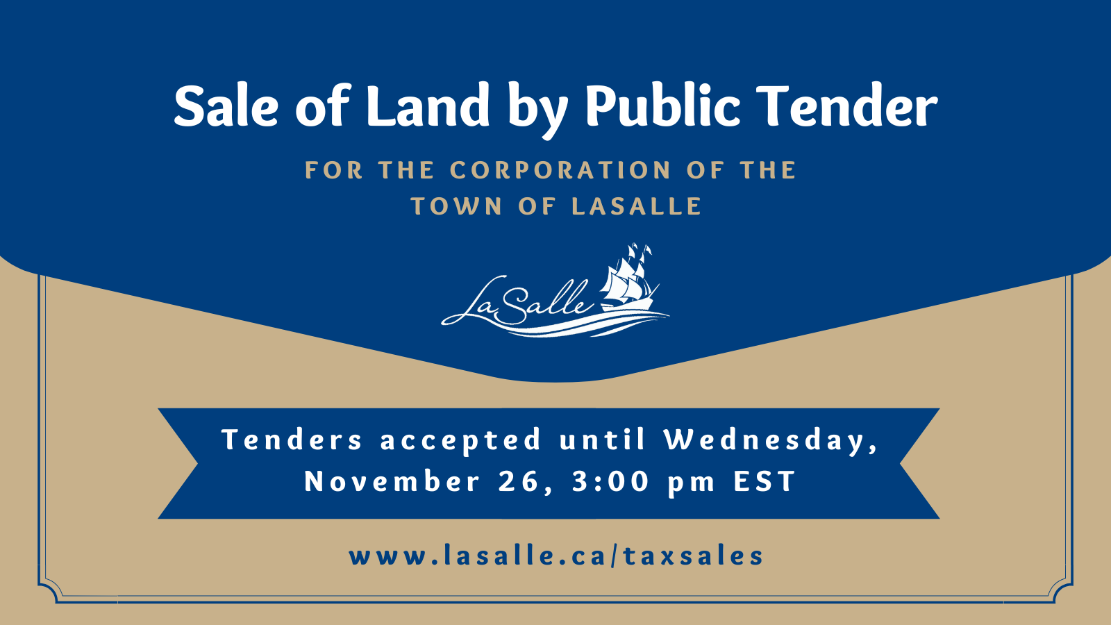 Tenders are invited for the purchase of land(s) and will be received until 3:00 pm on Wednesday, November 26, 2025, at the Town of LaSalle, 5950 Malden Road, LaSalle, Ontario. The tenders will be opened in public on the same day at 3:05 pm in Council Chambers.