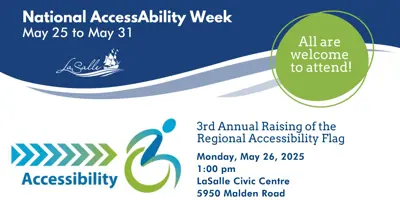 The Town of LaSalle will be raising the Regional Accessibility Flag at a ceremony on Monday, May 26 at 1:00 pm at the LaSalle Civic Centre, 5950 Malden Road, to mark the beginning of National AccessAbility Week.