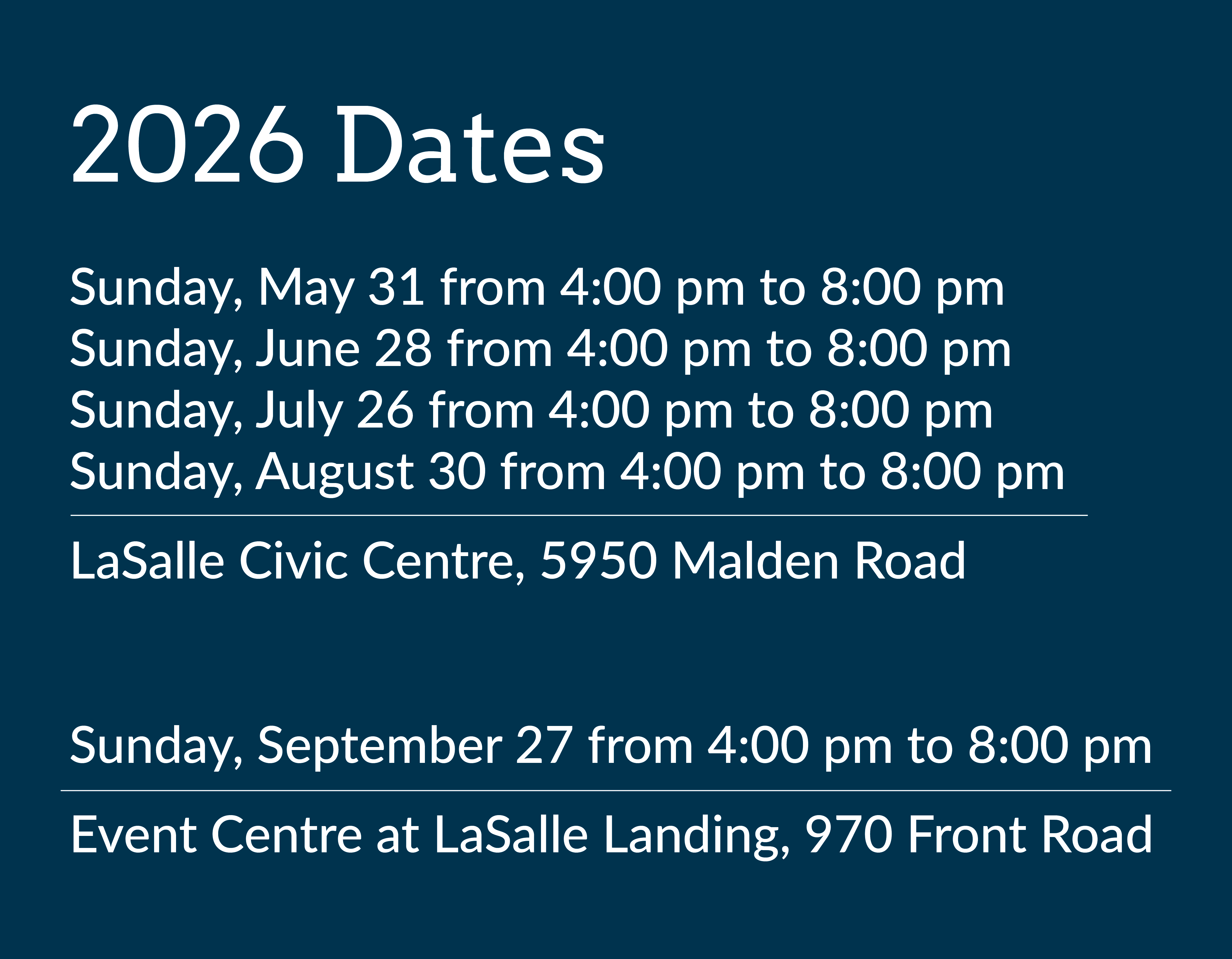 In the case of rain or inclement weather, the Market will be held indoors at the Event Centre at LaSalle Landing, 970 Front Road. Visit the LaSalle Events Facebook page for updates the date of the event.
