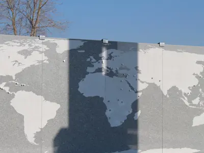 The map of the world behind the monument feels smooth for water and textured for land. Pins on the map mark the locations where Canada's Armed Forces have been at war or conflict and engaged in peacekeeping missions. Located beside the map is a legend that explains Canada's military presence over the years. The steel plate at the top is in reference to the harshness of war.
