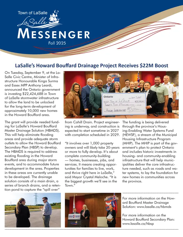 The LaSalle Messenger is a traditional, printed newsletter that is published once in spring/summer and once in fall/winter. This communication is delivered by Canada Post and arrives direct to all Town of LaSalle mailboxes twice per year. Click the images below for an electronic version:
